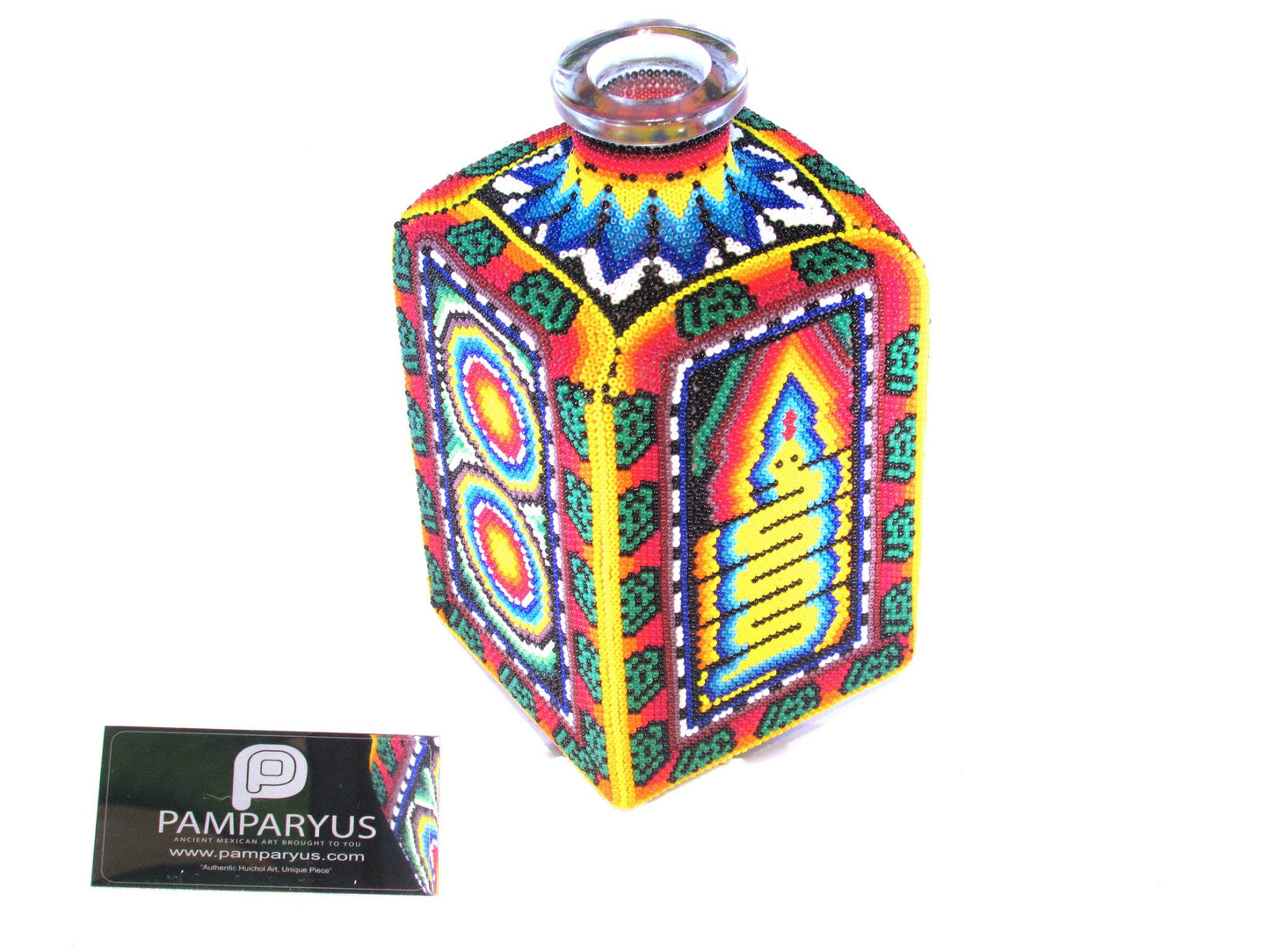 Licorera realizada por artesanos huicholes con pegamento especial y chaquira de cristal, podemos hacerla a tu gusto con los colores y figuras que más te gusten.