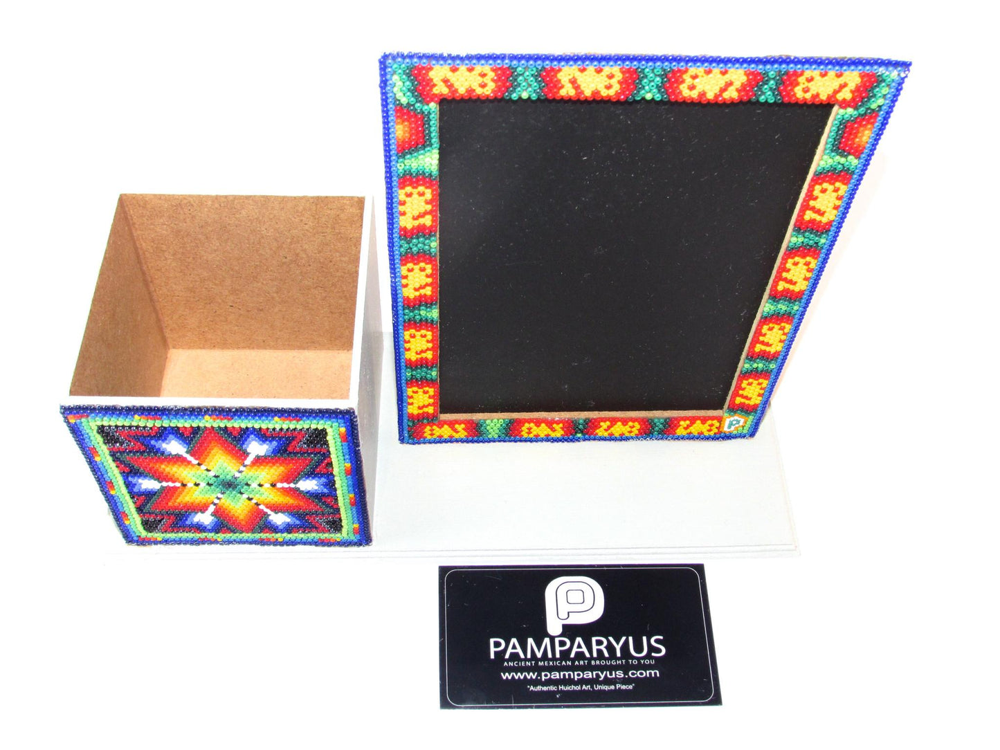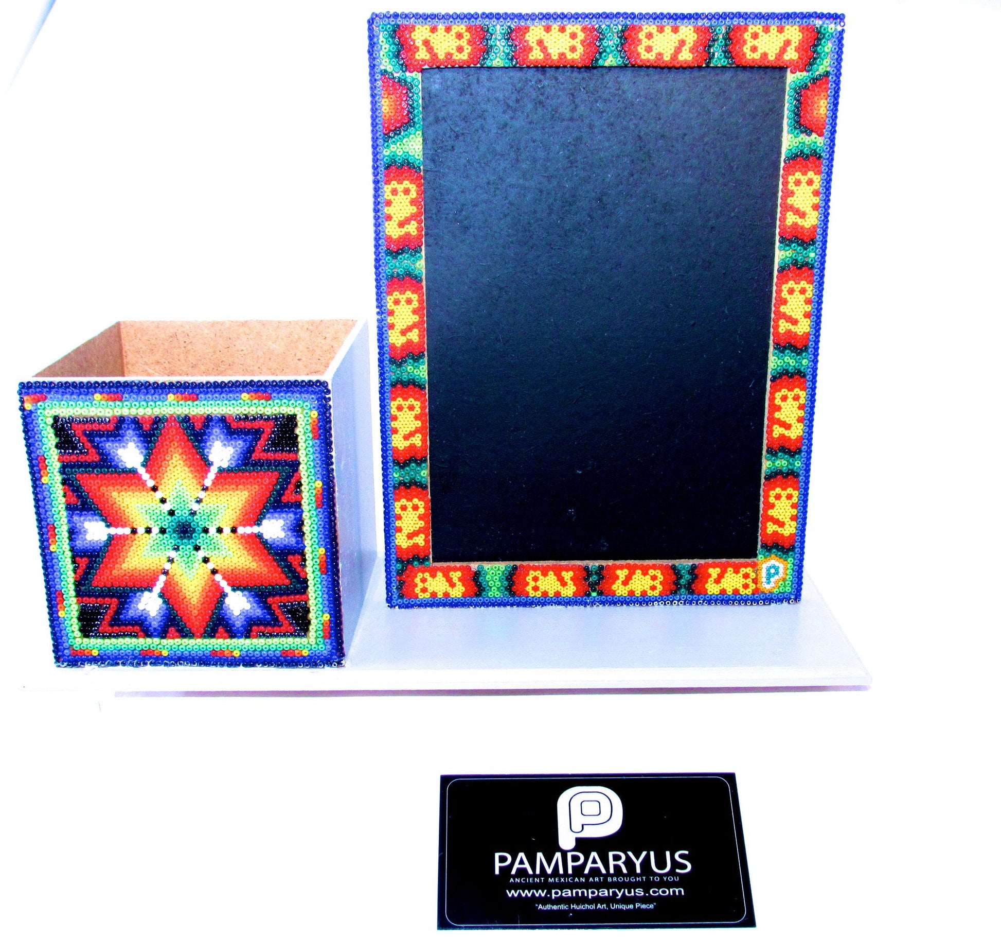 Porta Plumas con pizarrón, útil para la oficina o casa, deja tus notas en el. Realizado por artesanos huicholes con pegamento especial y chaquira de cristal. Pieza con mas de 500 chaquiras.